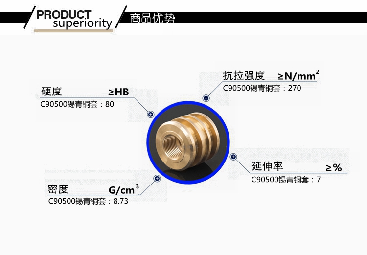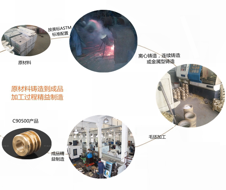 本產(chǎn)品實行ASTM標(biāo)準(zhǔn)………………………………………………… 根據(jù)客戶產(chǎn)品需求我們提供的鑄造方式有:離心鑄造,連續(xù)鑄造和金屬型鑄造。…………………………………………………………… 牌號C90500合金銅化學(xué)成分:Cu86-89 Sn9-11 Pb0.3 Zn1-3 Fe0.2 Al0.005 Si0.005 Ni1 Sb0.2 P1.5 S0.05………………對比國內(nèi)相近牌號:ZCnSn10Zn2