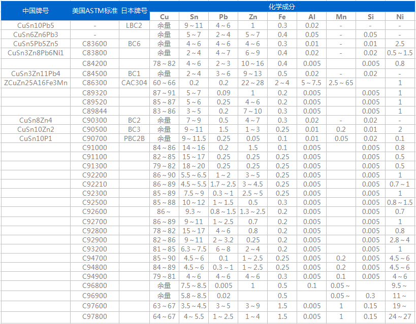 PBC2(CAC502)鑄造錫青銅銅合金硬度高,耐磨性極好,不易產(chǎn)生咬死現(xiàn)象,有較好的鑄造性能和切削加工性能,在大氣和淡水中有良好的耐蝕性,工作溫度可達(dá)260°。PBC2(CAC502)鑄造銅合金可用于高負(fù)荷(20MPa以下)和高滑動速度(8m/s)下工作的耐磨零件,如電動機(jī)軸承、機(jī)床螺紋件、螺母、發(fā)動機(jī)進(jìn)推氣門導(dǎo)套、連桿、襯套、軸瓦、齒輪、蝸輪等。對應(yīng)美國牌號C90700,國標(biāo)ZCuSn10P1